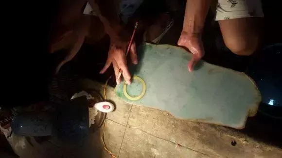 接着我们要在这些石片上,用避劣取优的方式画手镯外型,看看能取几个手镯。