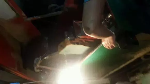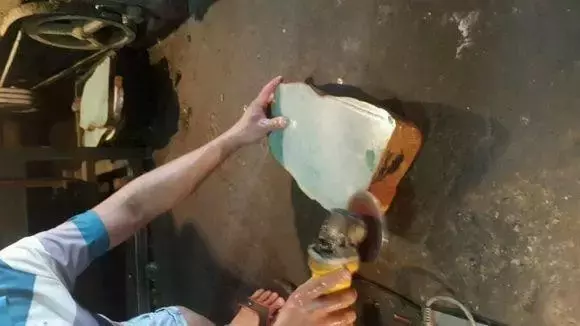 准备开切了!首先师傅先给原石磨平了棱角,又磨平了皮壳,说是以便安装在切割机上,我不懂,我就想着师傅应该是有强迫症吧,哈哈。