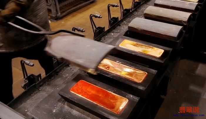 工人在冶炼车间将金粒熔化铸成金条。