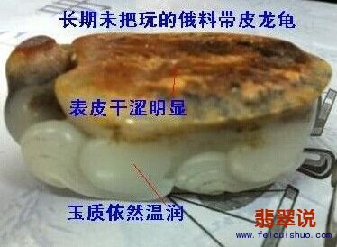 我的答案是:玉本身不会,但皮很可能会。这里说的可能会“越盘越干、越盘越涩”的皮是那层“僵皮”(伴生石皮、风化皮、腐蚀层)。大家多已学会拭去玉件上“美容油”、“美容蜡”后再看好坏了,但俄料的这层“皮”性质和玉不同,其中SiO2、FeO含量低,而AlO,、MgO、K2O、Na2O含量高,油、蜡等能沁入较深,擦拭等简单的方法难于立即除去,而随着长期的盘玩,油、蜡挥发或升华掉了,也就“变干”了,其实这才是它的“本来模样”。另外提醒一点,目前市场上很多俄料玉件皮子僵但巧色过于鲜亮的,颜色往往都是经过“加强”的。