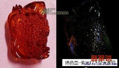 这是天然缅甸琥珀与烤色琥珀放在一起,在紫光灯照射下的照片。对比下,很容易鉴别的 作者:江一帆