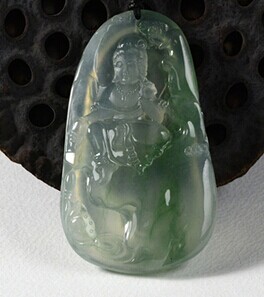 (2)冰种翡翠 质地与老坑种有相似之处,无色或少色,冰种的特征是外层表面上光泽很好,半透明至透明,清亮似冰,给人以冰清玉莹的感觉。若冰种翡翠中有絮花状或断断续续的脉带状的蓝颜色,则称这样的翡翠为“蓝花冰”,是冰种翡翠中的一个常见的品种 。冰种玉料常用来制作手镯或挂件 。无色的冰种翡翠和“蓝花冰”翡翠的价值没有明显的高低之分,其实际价格主要取决于人们的喜好。冰种是中上档或中档层次的翡翠。