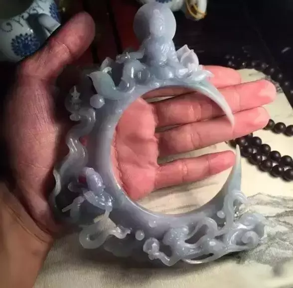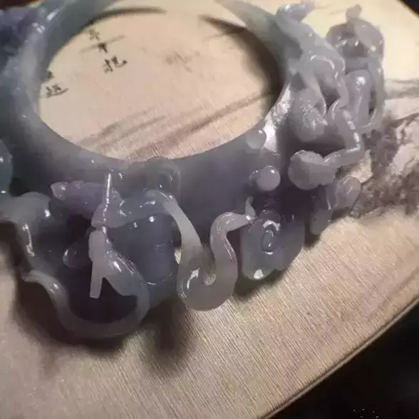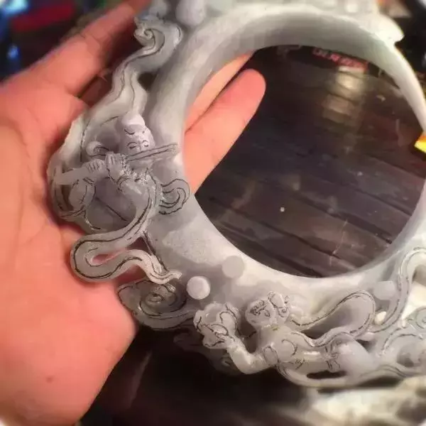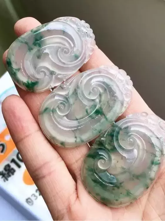 下面这块是不怎么好的手镯边角料,比上面那块水头差多了,一开始就没打算做挂件,拿去给大师雕了。但也确确实实从一件不起眼的边角料,幻化成了令人称赞的作品。
