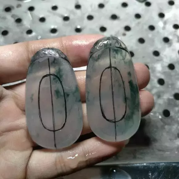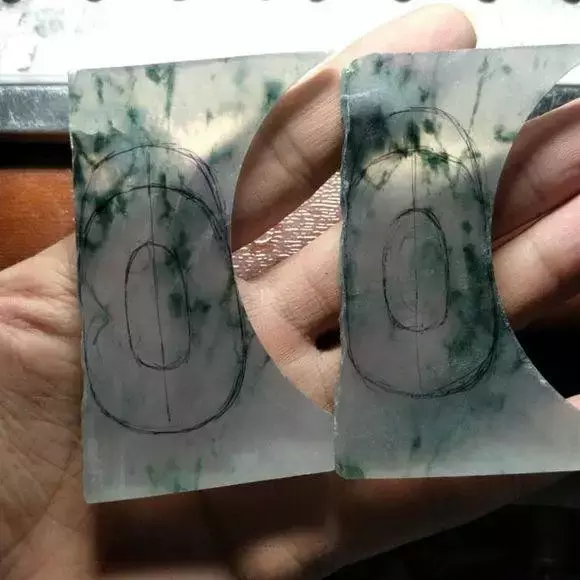 这两块边角料是同一块料子切剩的,看了一下刚好可以雕刻出一对吊坠来,底子还不错吧!