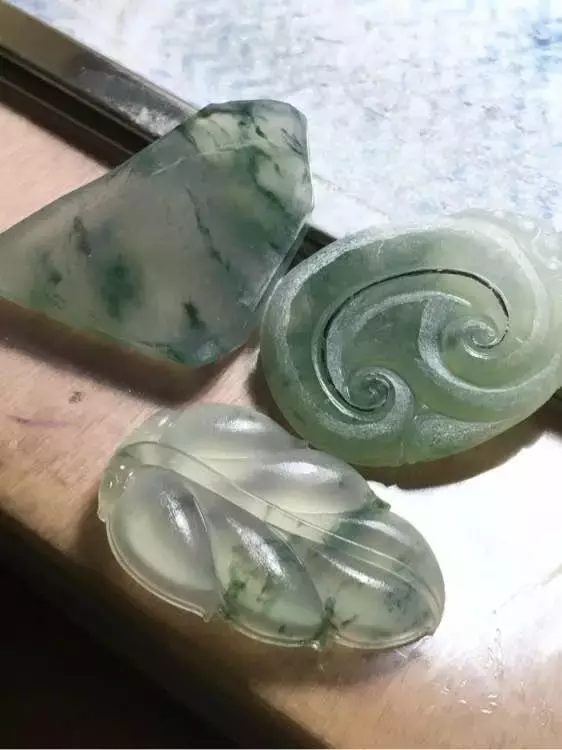 这是开料余下的一些翡翠手镯边角料,料子是非常不错的所以一直没有卖掉。但都是小碎料,就可以雕一些比较小的玩意,最近比较闲,就拿来瞎捣鼓了。谁能想到雕刻后竟然出货效果杠杠的,现在给大家看看这意外的过程喔!