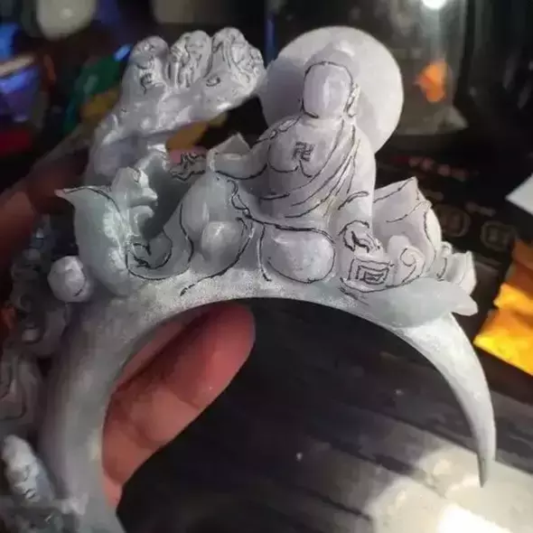 上面是交到大师手里的样子,雕刻前大师先在料子上勾勒出轮廓,这是创作的重要过程。动第一刀都需要经过数十次的修改,甚至上百、上千次的修改,毕竟料子切了就粘不回来了。经过一轮粗雕刻,大致轮廓出来了。