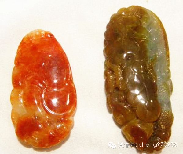 上图:烧红翡翠(左)颜色鲜艳,界线不明显,天然翡翠(右)颜色偏暗,界线清晰。 所以,“烧红”翡翠具体归属于优化范畴还是应归属于处理范畴,是一个值得斟酌的问题。我个人认为, “烧红”翡翠应当归结为对翡翠的处理范畴,也就是和翡翠B货或B+C货一样,是一种不应当提倡的翡翠处理方法,起码在质检证书上应当给予注明“经热处理”,起到明白消费的效果。