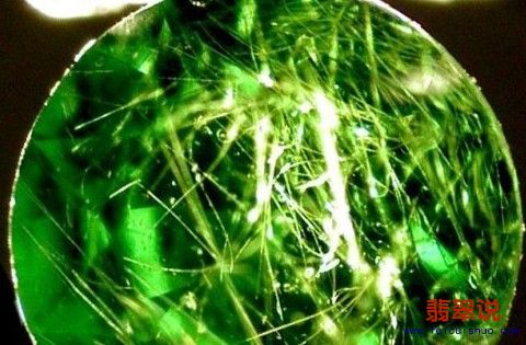 这也是为什么优质的翠榴石与祖母绿价格相当的原因了。但他们不同的绿色质感,看个人喜爱了。 马尾包裹体 不再是识别翠榴石的标志 先了解一下什么是马尾状包裹体吧! 在显微镜下观看,翠榴石内一般都有一些石绵纤维,由中间的结晶态包裹体发散出弯曲的黄棕色至黄色纤维,这些束状的丝和发散的线状包裹体看起来很像焰火。 曾经主要产自俄罗斯的乌拉尔山脉,看是否有马尾状包裹体,是最简单鉴别俄罗斯翠榴石的标志之一,但不是所有俄罗斯产的都有马尾的。现在很多其他产地的翠榴石也是木有马尾包裹体。